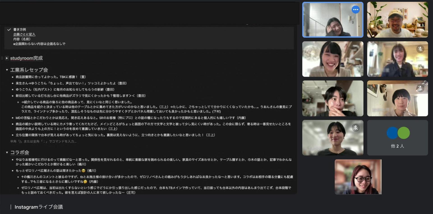 インスタライブ会議では、先月1ヶ月分の振り返りと、来月1ヶ月分のテーマ決め!PRチーム、ショールームチーム、施工チームからインスタライブに関わる人、総勢10人でのミーティングです!