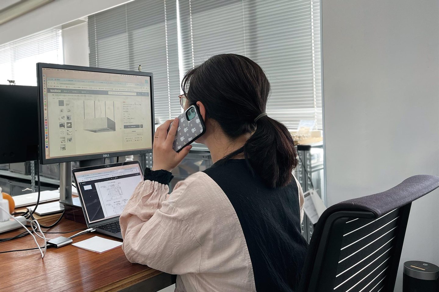 月曜日の作業で完成した空間の撮影から1日がスタート!撮影後は、ショールームに立つために、オフィスへ移動。昼間に移動する時は、次回のインスタグラム投稿を何にしようか考えたり、移動しながらできることをやっているそうです。