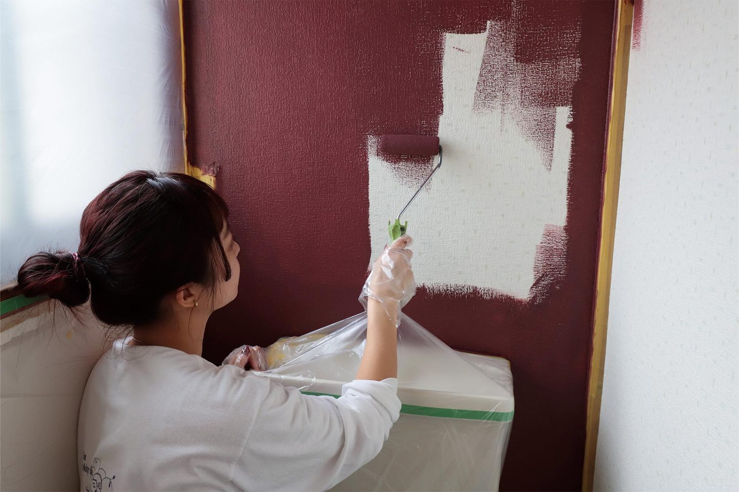 この日は朝会後に、連載記事の撮影に取り掛かります。トイレの改装に挑戦!ピンク色に壁を塗り、トイレットペーパーホルダーなどのパーツを付け替えました。三上さんが作業を行い、もう1人のスタッフが作業風景を撮影する形で進めます。
