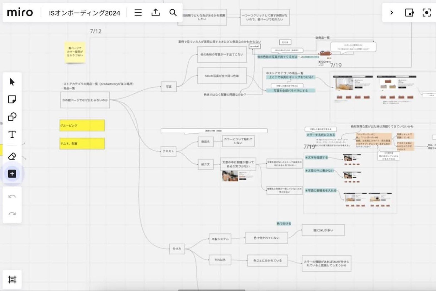 そこで、改めて分かりにくいポイントを洗い出す作業からスタート。下の写真のように、miroというツールで問題の要因を洗い出し、一つ一つどうしたら改善できるかを考えていきます。この作業からも、自分が今まで課題の一面しか捉えられていなかったことに気づきました。