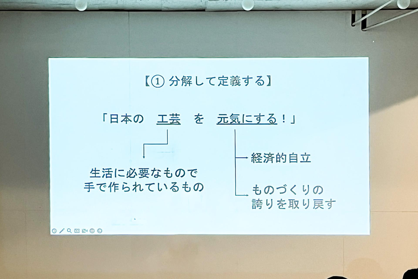例えば、①では「日本の工芸」とは?「元気にする」とは?生活に必要なものが人の手で作られていたら「工芸」。経済的自立を果たし、ものづくりの誇りを取り戻した状態が「元気」だと言えるよね。