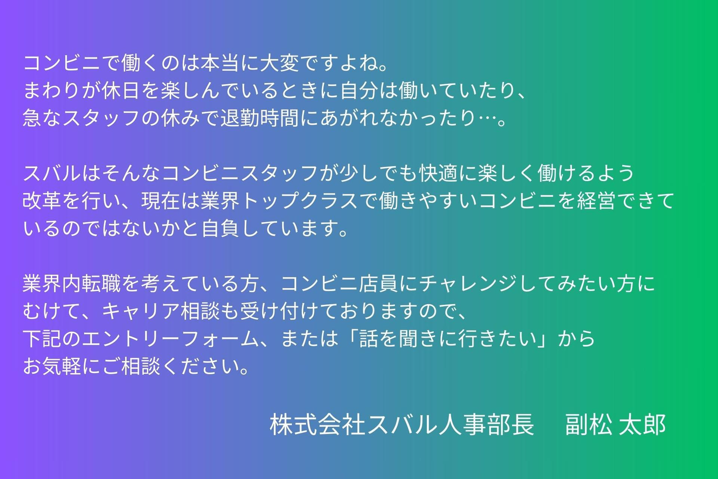 今回は、スバルの人事責任者である副松をご紹介します!売り場経営で日本一の売り上げを叩き出した経験のある彼が、なぜコンビニの店舗経営をしたいと思ったのか。そして、なぜ人事に転身したのか。根っからの...