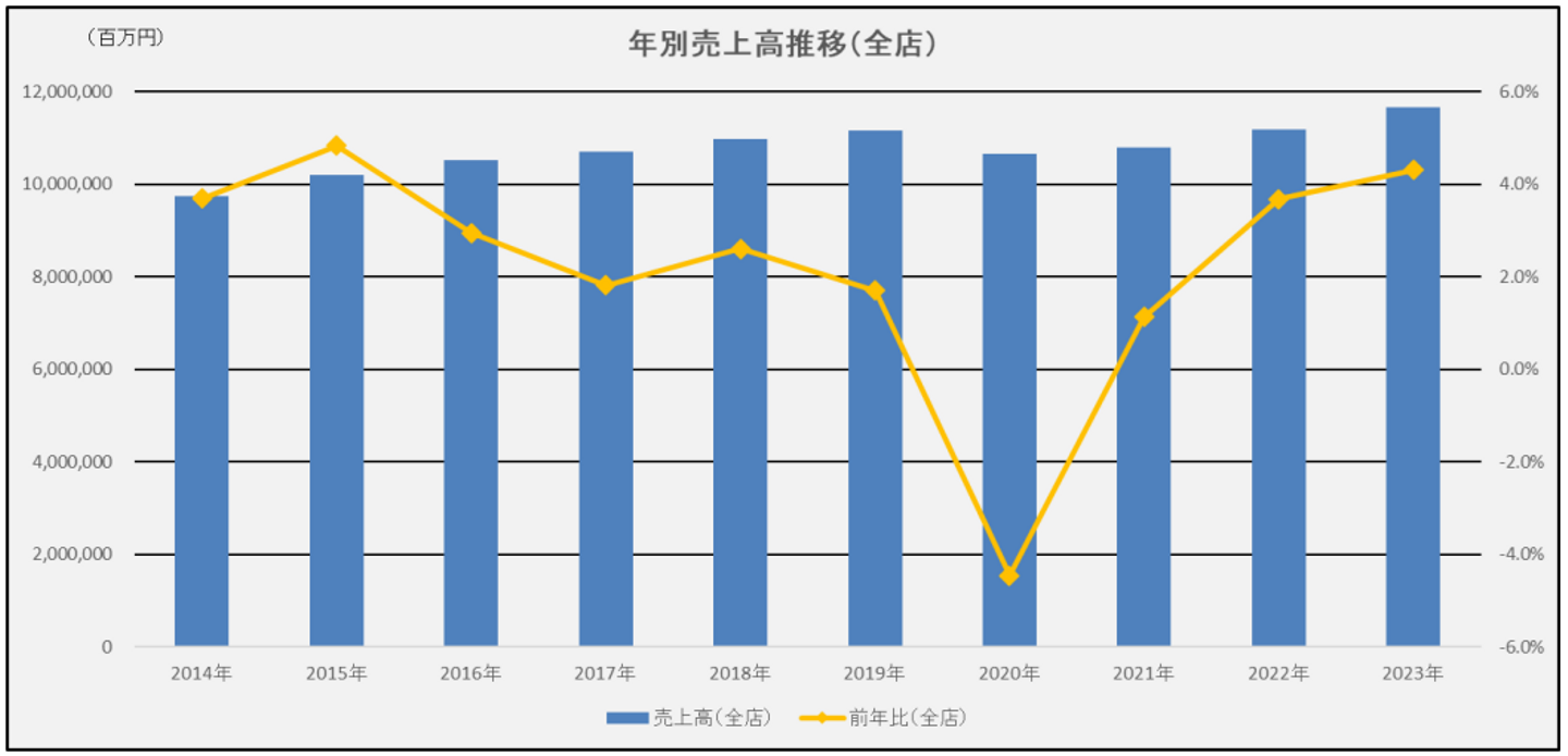 【出典:日本フランチャイズチェーン協会|コンビニエンスストア統計調査年間集計(2023年1月から12月)】