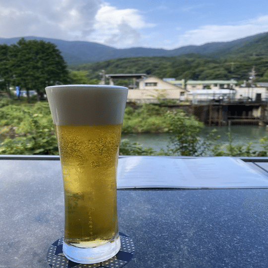 客室露天風呂に浸かりながら川を眺め、足湯でビールを飲み、夕飯はステーキ。