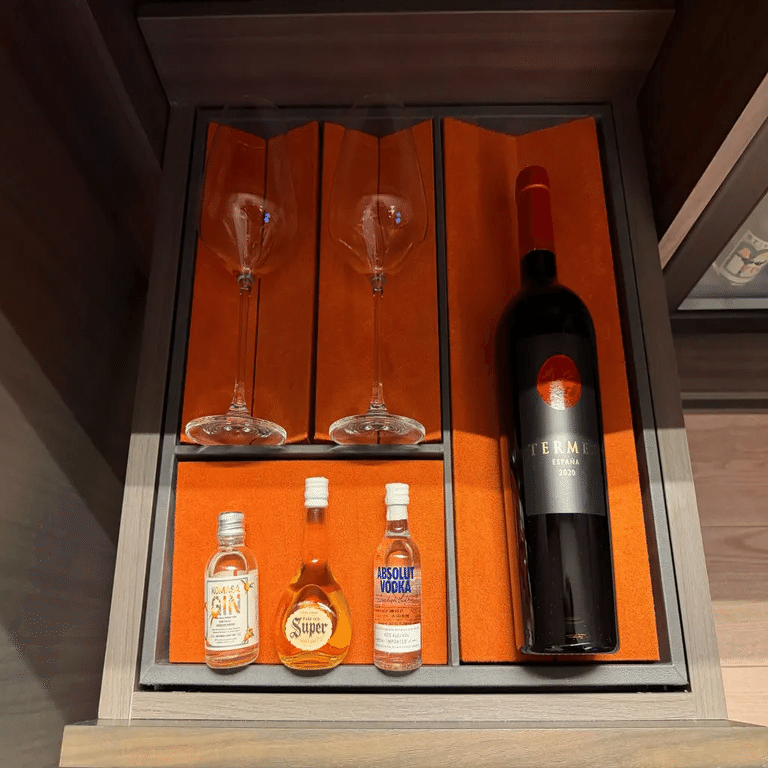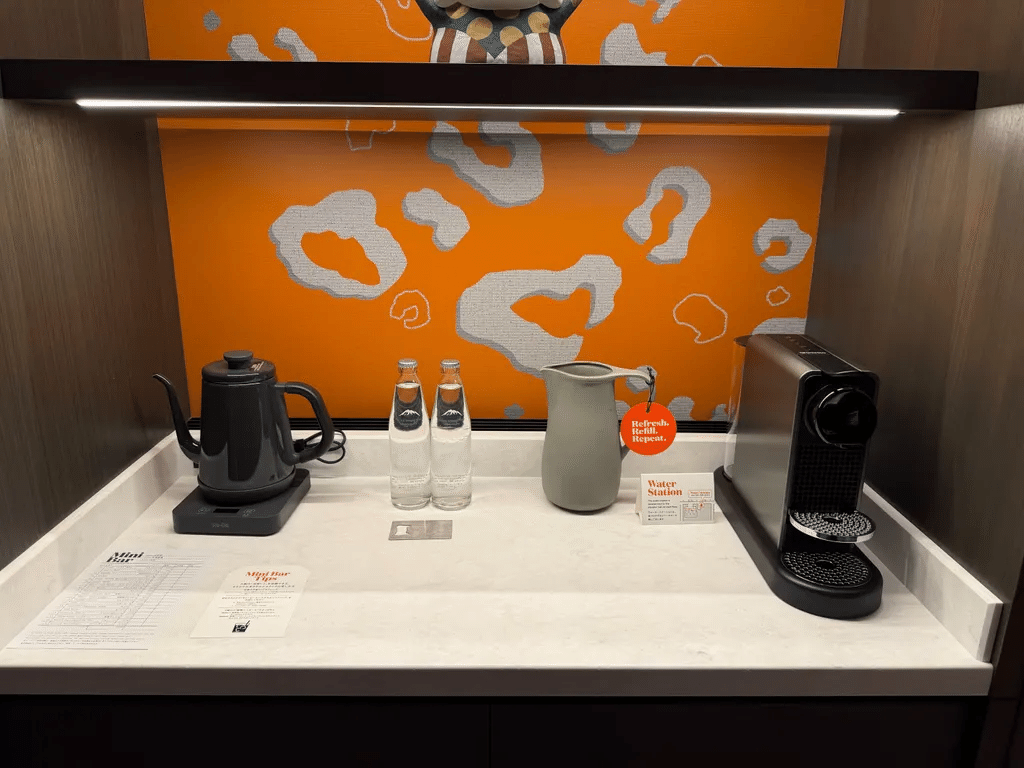 ミニバーにはコーヒーや紅茶、ミネラルウォーターが揃い、共用部のウォーターサーバーで補充可能です。