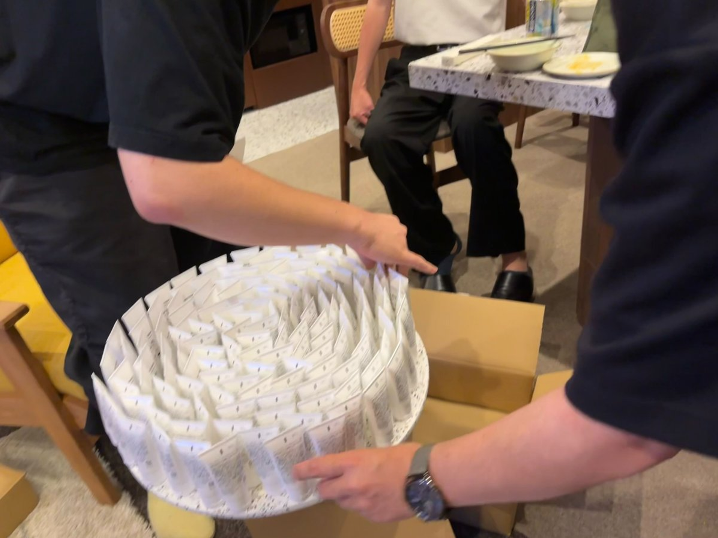 新しくオープンしたホテルの一室で、社員たちが仕事終わりに集まって、料理をつくり、お酒を飲み、そして――まさかの“シール貼り”?