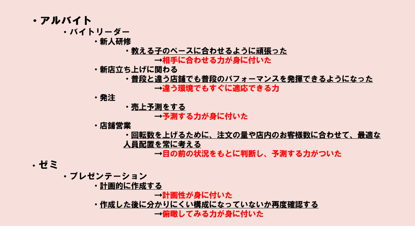 そこで私がまずやったことは、学生時代に何をしたのかを箇条書きにしました。