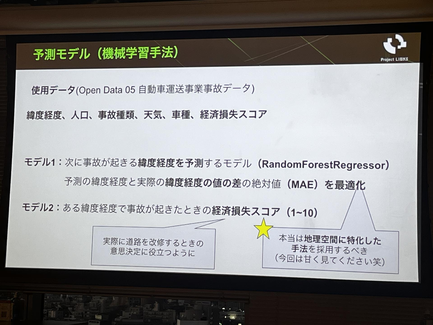 物流系のチームは、実際の事故データをもとに事故地点を地図上に可視化し、