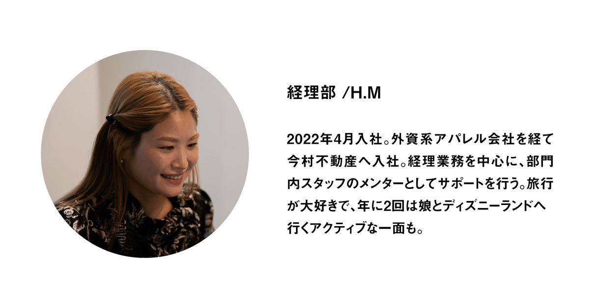 長年勤めた外資系アパレル会社を退職し、未経験の不動産業界の経理として今村不動産に飛び込んだHさん。入社からこれまでにあった仕事や気持ちの変化、そしてこれからのキャリアビジョンについてお話をうかがいました。