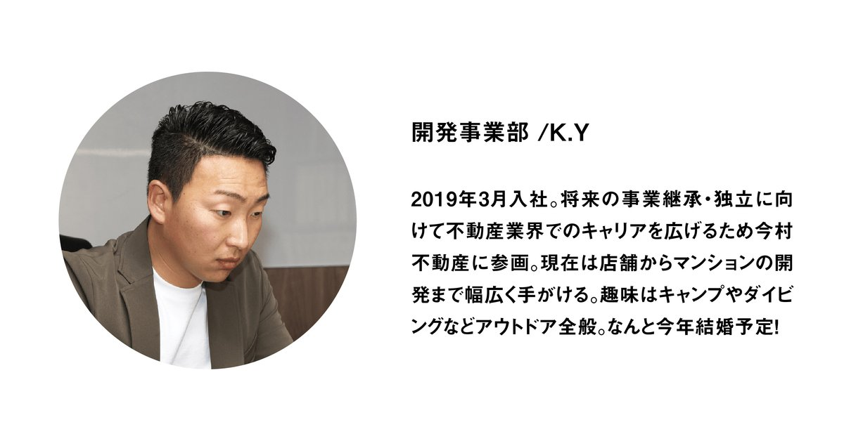 強い信念のもとそんな風に話してくれたのは、入社6年目のKさん。今村社長や専務とは旧知の仲で、不動産営業としてのノウハウや知見を広めるために入社を決意したそうです。今村不動産の会社としての魅力や、本人の将来について聞きました。