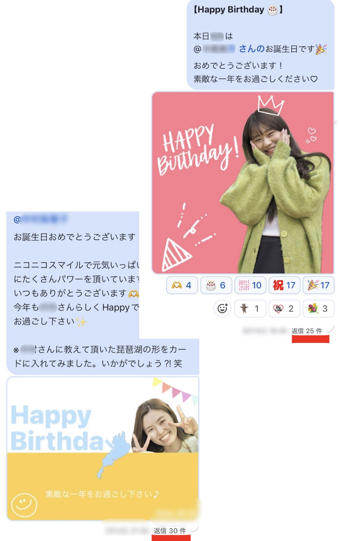 誰かが、お誕生日のお祝いスレッドを立てると、たくさんスタンプがついたり、スレッド(返信・コメント欄)が他のメンバーからのお祝いコメントや日々の感謝で溢れます♡