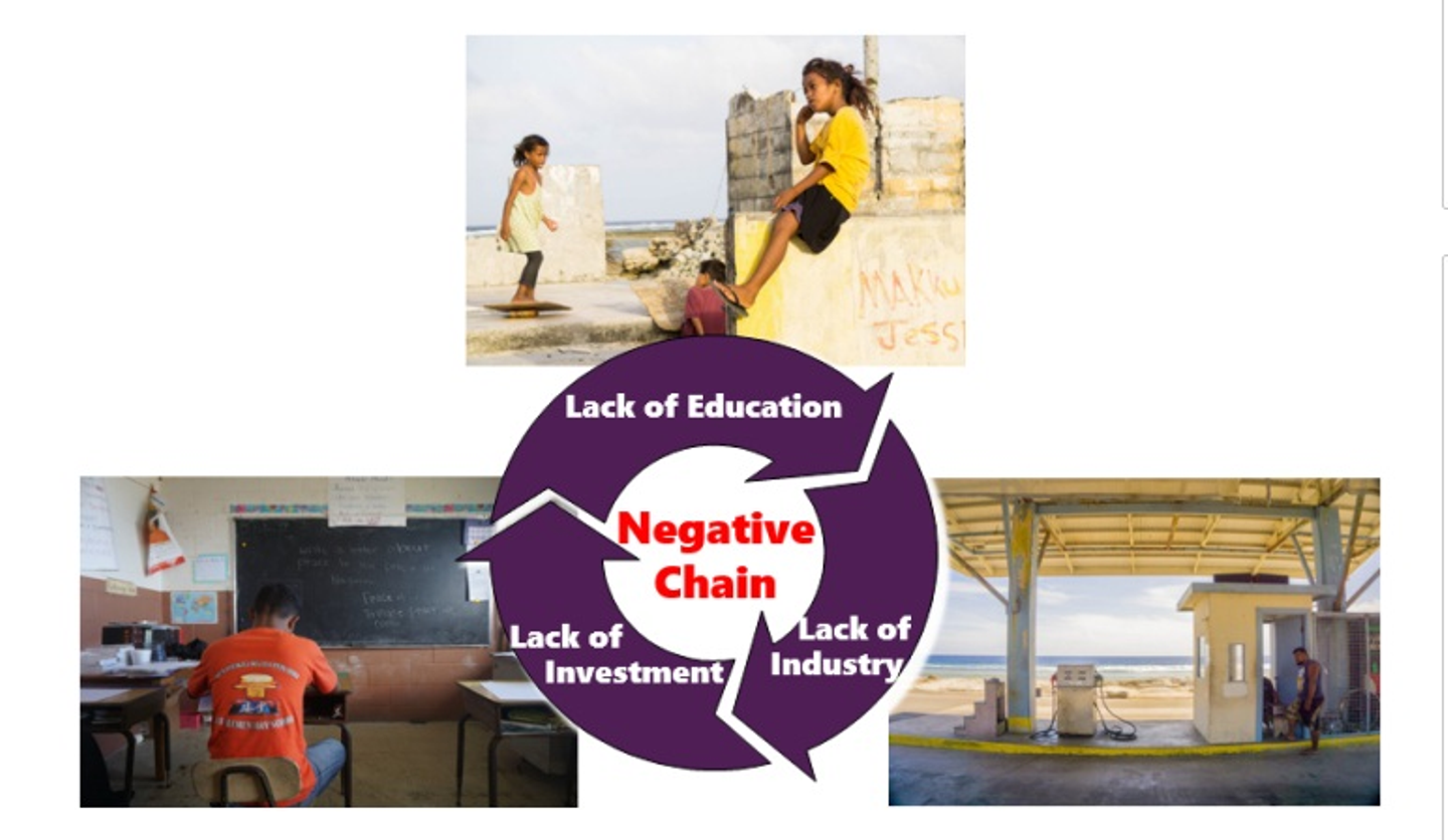 マーシャル諸島では、画像の通り、教育・産業・税収の3つの悪循環が存在します。