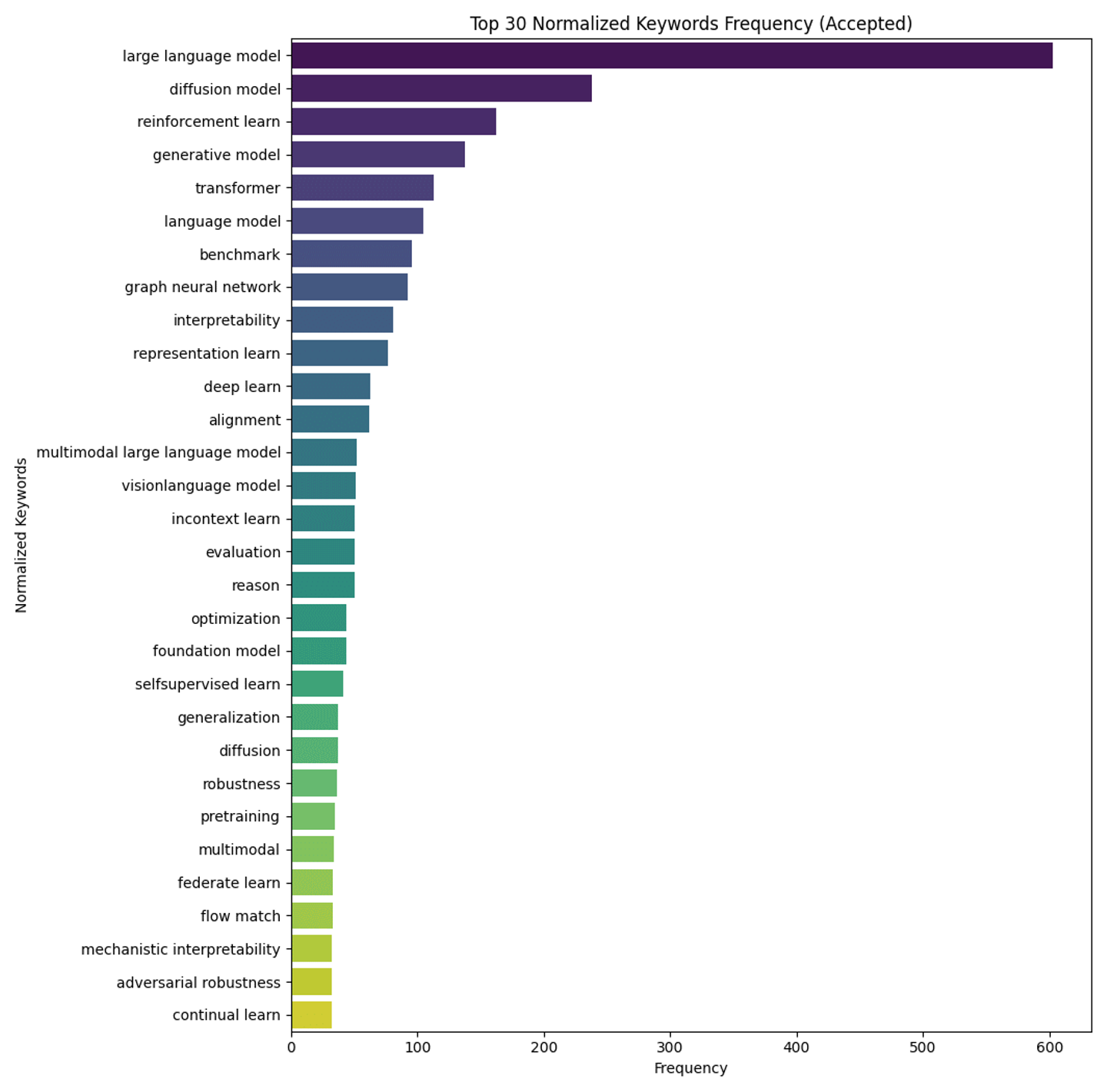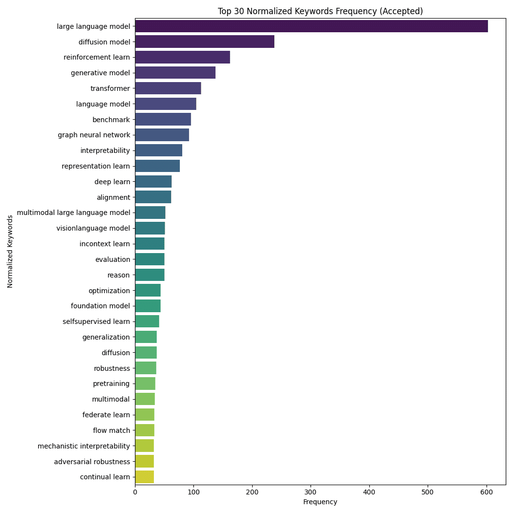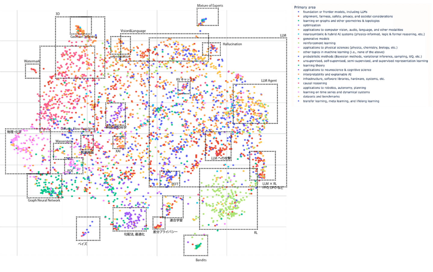 大規模言語モデルがダントツで多く、次に拡散モデル、強化学習ときています。Graph Neural Network に関する研究も100件近くあったようです。また、ベンチマークに関する研究も多かったです。実際、 LLM やエージェントに関する評価指標を提案する研究のポスターを会場でもよく見かけました。