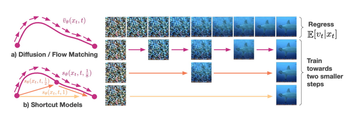 拡散モデルやフローマッチングでは、高品質な画像が生成できる一方、生成時に多くのステップが必要で高コストになります。これまでに提案されてきた少ないステップで生成するための手法では、モデルを蒸留するなどに段階の学習が必要であるなどの問題がありました。
