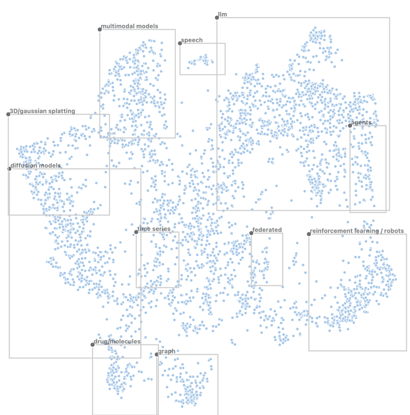 論文のトレンドについても見ていきます。以下の図から分かる通り、LLMやDiffusion Modelに関する研究が最も多く、それに続いて3D・Gaussian Splatting、強化学習・ロボティクスに関する研究が多く発表されています。そのほかにも、マルチモーダル、グラフニューラルネットワーク、エージェントといった分野の研究も数多く見受けられます。LLMやDiffusion Modelは、一般的に学習コストが高く、取り組むハードルが高いと感じられがちですが、今回はPost-TrainingやTest-Time Adaptationなど、すでに学習済みのモデルを低コストで賢く活用する研究が多く見られました。このような動向はICLR2025に限らず、CVPRなど他のトップカンファレンスでも共通しており、今後ますます求められる技術であると感じました。