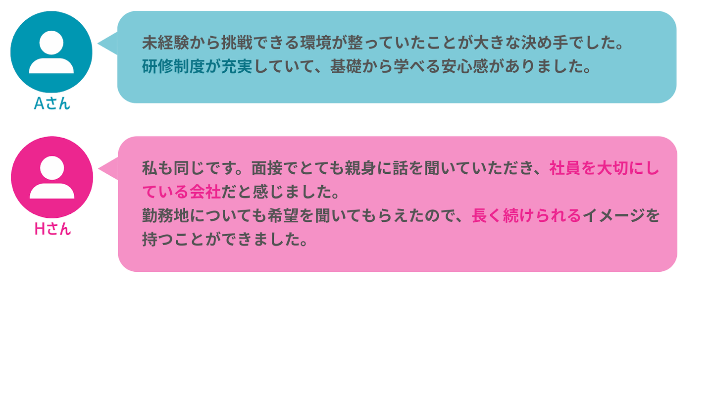 研修制度や資格支援、現場でのフォロー体制が整っているからこそ、未経験からでも安心して成長できる。そして、自分のキャリアを自分の手で広げていける。そんな土台があるからこそ、二人のように異業種からでも新しいキャリアを築いていけるのです。