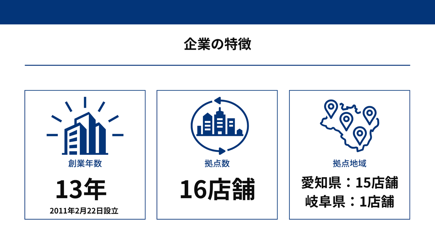 拠点地域は愛知県内15店舗(豊田市、名古屋市、一宮市、長久手市、日進市、高浜市、豊川市、豊橋市、蒲郡市)、岐阜県内1店舗(大垣市)となります。