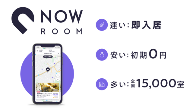 NOW ROOMは、初期費⽤0円、5秒で家が⾒つかるアプリです。 初期費用がないため、通常の賃貸と比較して3年以内であればNOW ROOMがお得になります。また、ホテルを予約するようにアプリで入居まで完結できる点が魅力です。 掲載されている部屋も普通賃貸・マンスリーマンション・シェアハウス・⺠泊・ホテル・ゲストハウスがあり部屋の種類も多様で、既に都内を中⼼に全国で15,000室を超える部屋を確保しています。 フリーランサーや外国人滞在者の増加、Z世代・ミレニアム世代の身軽に移動したい方々の増加や働き方の多様化によりニーズが増加しており、5⽉中旬のリリースから8,000名以上の⽅にご利⽤登録いただいています。