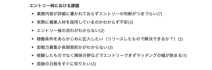 なので、どこで複業クラウドを知ったのか?エントリー・スカウトどっちをよく使うのか?どうやって検索しているのか?など具体的な行動をどんどん聞いていきます。