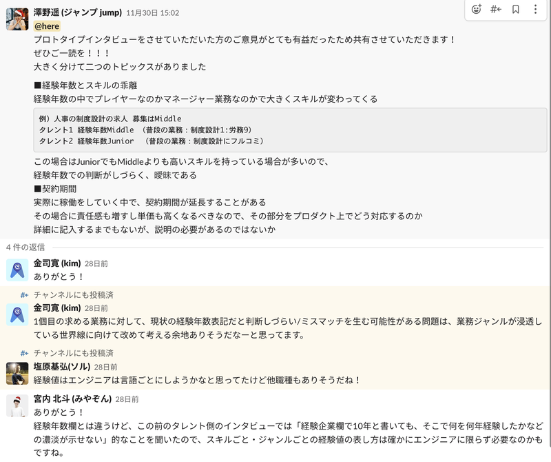 そこで最近、インタビュー参加者がその他のメンバーにインタビューのまとめを共有する仕組みを作りました。