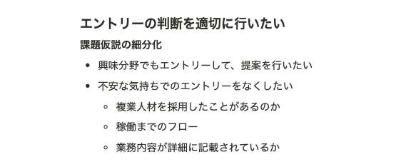 実際に複業クラウドで求人を探し、複業を始めたいユーザーはどんなことを思い課題と感じているのかを、日々のインタビューを思い出しながら仮説にしていきます。