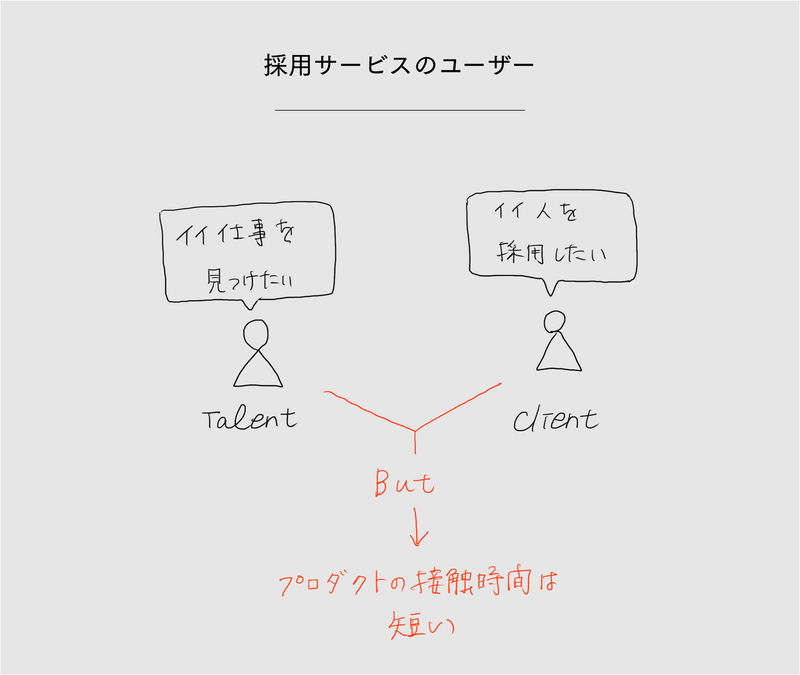 また、「採用」サービスには見逃せない大きな特徴として、求職者 / 採用者、双方共にプロダクトへの接触時間が短いことがあります。隙間時間ずっと触り続けたり、秒あたりのアクティブ率が重要な指標となるプロダクト(toBサービスであれば例えばSlack)にはなり得ない、ということです。
