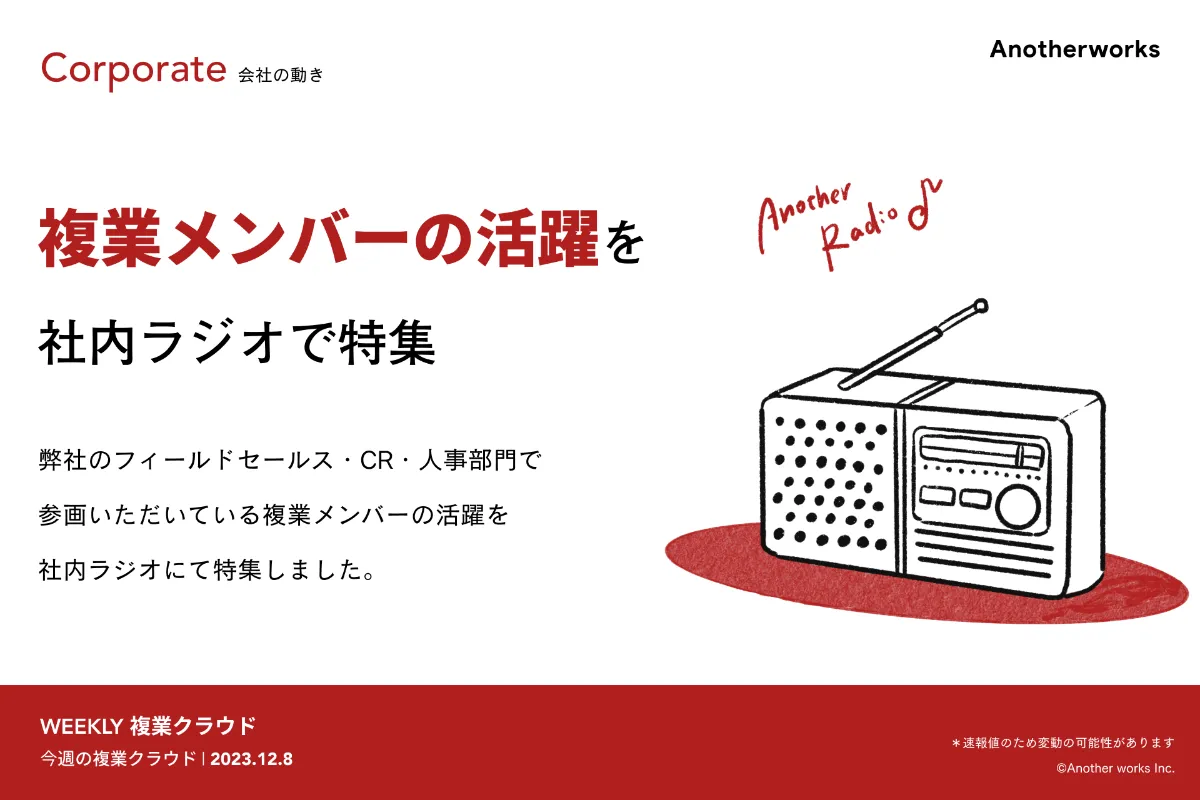 弊社フィールドセールス、CR、人事部門に参画いただいている複業メンバーの活躍を社内ラジオで特集しました。