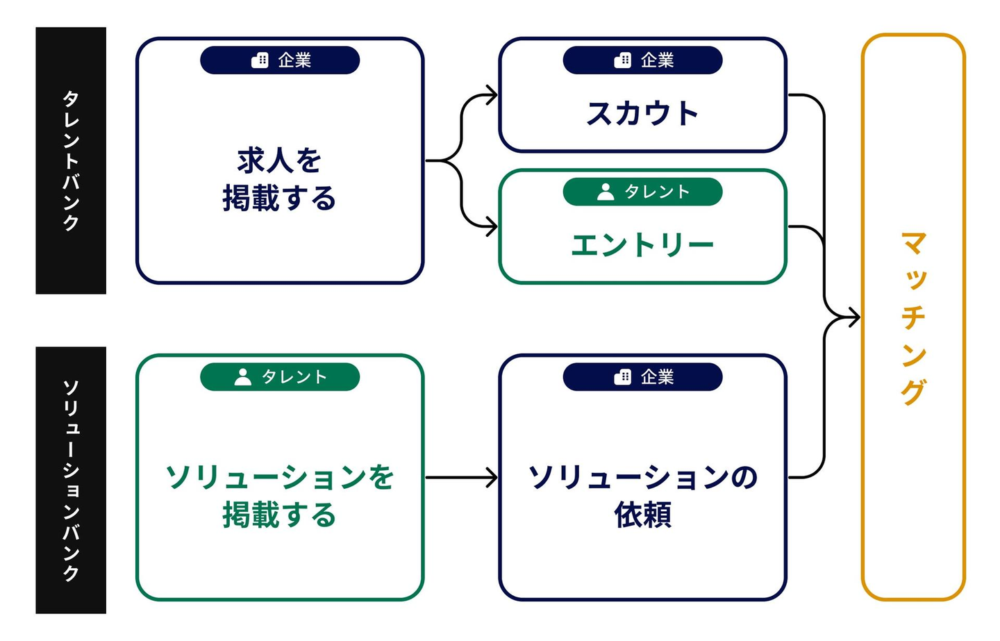 そこで、タレント自身が「ソリューション」と呼ばれる課題解決策を提案し、企業に対して提案できる仕組み「ソリューションバンク」を開発しました。これにより、企業は求人作成やスカウトが不要で、タレントからの提案を受け取ることで、より適切な人材とのマッチングが可能となります。