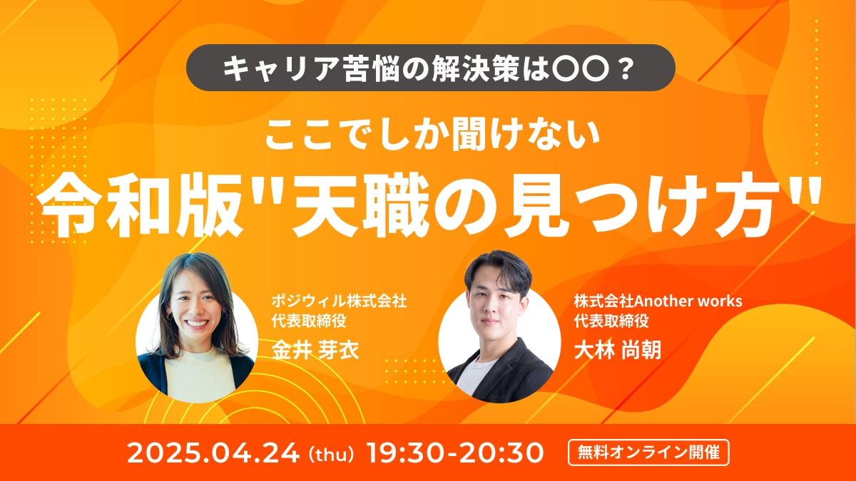 複業したい個人と企業や自治体を繋ぐ、総合型複業マッチングプラットフォーム「複業クラウド」を運営する株式会社Another works(本社:東京都港区、代表取締役:大林 尚朝、以下「当社」)は、キャリア相談者数約4万人のキャリアのパーソナルトレーニング「POSIWILL CAREER」を運営するポジウィル株式会社(本社:東京都港区、代表取締役:金井 芽衣)と共催し「キャリア苦悩の解決策は〇〇?ここでしか聞けない令和版”天職の見つけ方”」と題した無料オンラインウェビナーを4月24日(木)19:30から開催いたします。