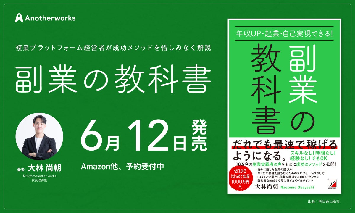 複業したい個人と企業や自治体を繋ぐ、総合型複業マッチングプラットフォーム「複業クラウド」を運営している株式会社Another works(所在地:東京都港区、代表取締役:大林尚朝)は、当社代表取締役の大林尚朝が書籍『年収UP・起業・自己実現できる!副業の教科書』を有限会社明日香出版社から発売することをお知らせいたします。2025年6月12日より順次書店、ネット書店を中心に販売されます。現在、Amazonなどで予約販売を受け付けています。