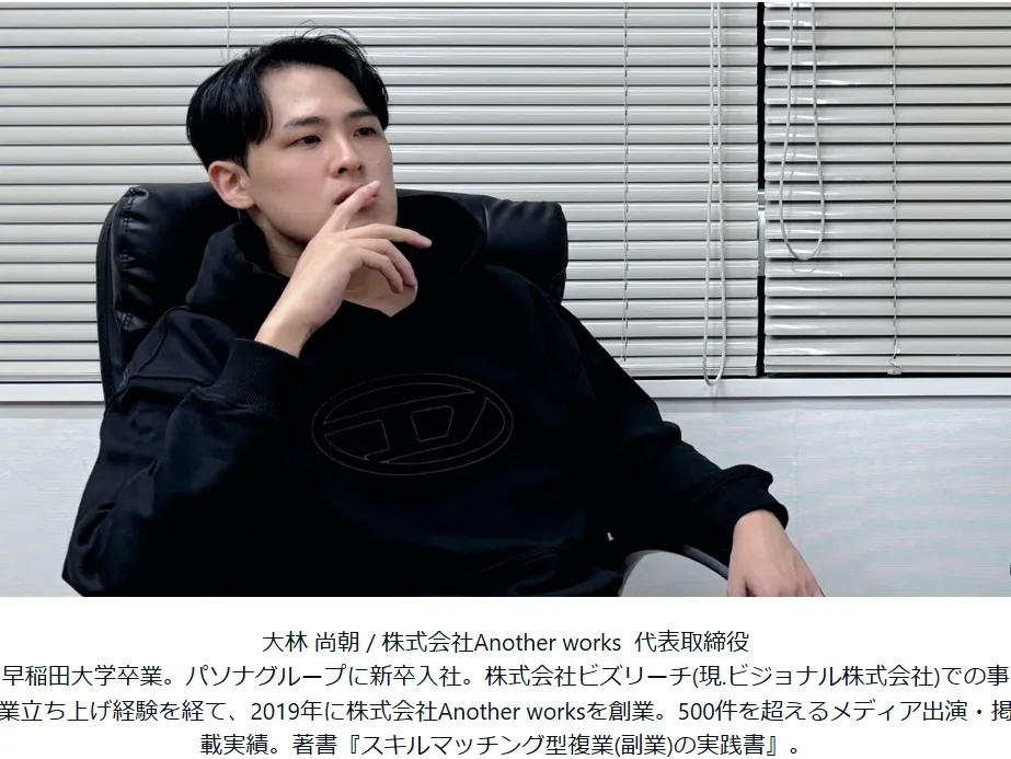 株式会社Another works代表の大林です。複業したい個人と企業・自治体を繋ぐ総合型複業マッチングプラットフォーム「複業クラウド」を運営しております。