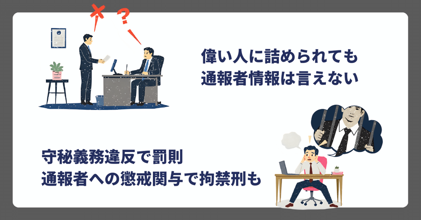 - 「個人への法的リスク」 通報者の氏名や通報内容など、職務上知り得た情報を厳格に管理し必要な範囲以外へ共有してはなりません。この守秘義務に違反し通報者が不利益を受けた場合、従事者個人に懲役または罰金が科される可能性があります。会社のため、社員のために動いた結果、自分自身が法的なリスクを負います。