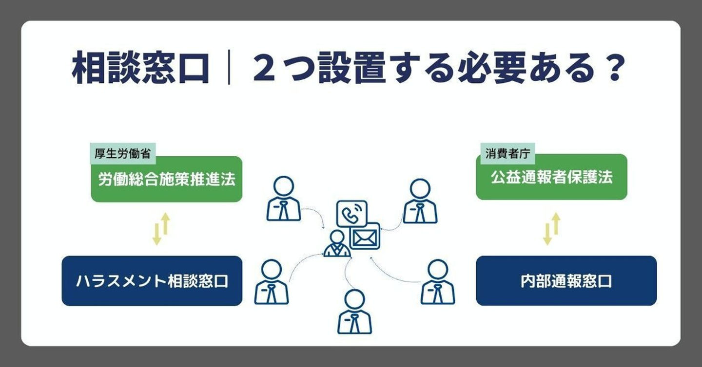 ところで、法律で定められた社員からの相談窓口は、同種のものが2つあります。「ハラスメント相談窓口」と「内部通報窓口」です。