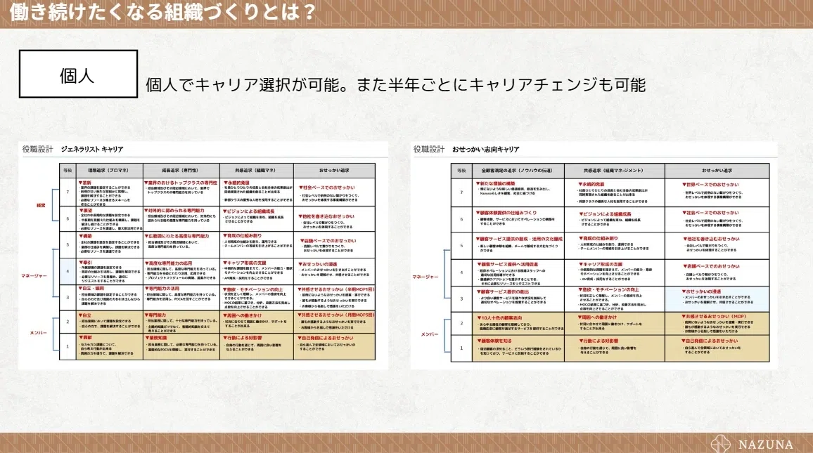 一般的な会社だと、キャリアって“気づいたら決まっている”ことが多い。いわゆる年功序列。けれど僕たちは違います。Nazunaでは、入社時にまず「どんなキャリアを歩みたいか」を自分で選ぶ。そして半年ごとに、見直すタイミングを必ず設けています。