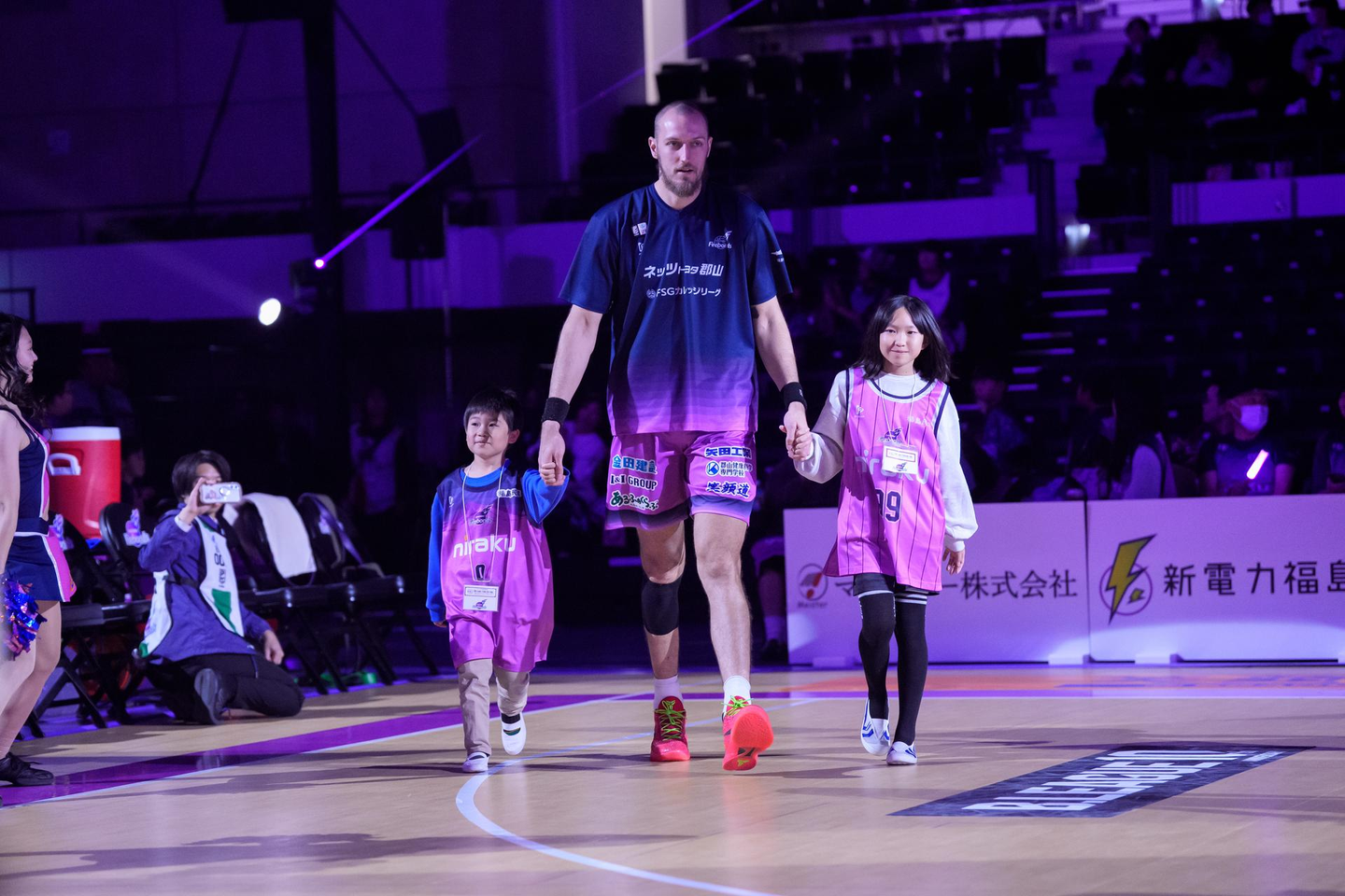 暗転した会場に、福島ファイヤーボンズのチームカラーである紫のスポットライトが差し込み、選手が入場。選手をエスコートする大役を任されたエスコートキッズたちが、身長差のある選手としっかりと手をつないで、緊張と誇らしさを胸にコートへ。