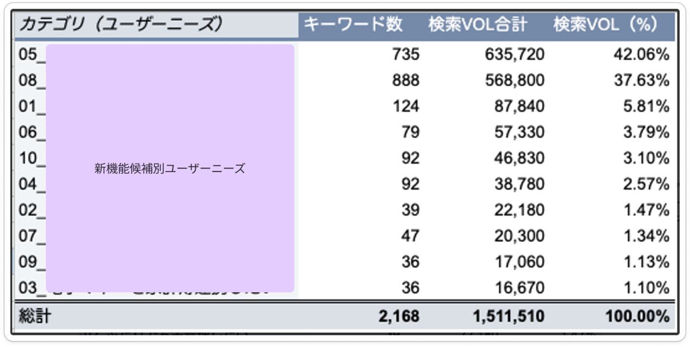そのときは、PMが検討している新機能候補ごとに解決する顧客課題を整理し、顧客がその状況に直面したときに「〇〇したい」と思うか定義。そして、「〇〇したい」と思ったとき検索するキーワードの洗い出しとそのボリュームをキーワード調査ツールを使って集計しました。