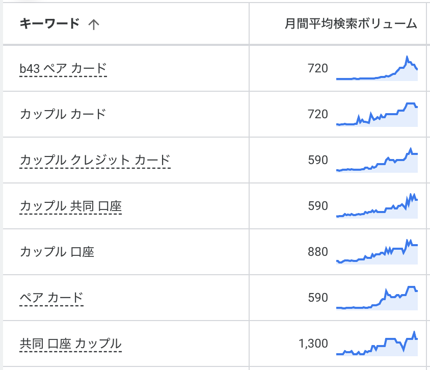 例えば、昨年はB/43ペアカードのユーザー獲得に力を入れていて、その結果、指名検索が前年比で2倍以上に成長しました。それに加えて、「カップル 共同口座」「カップルカード」など、ペアカードに関連する検索キーワードの検索回数も同様に2倍以上に伸びていて、右肩上がりで成長しています。