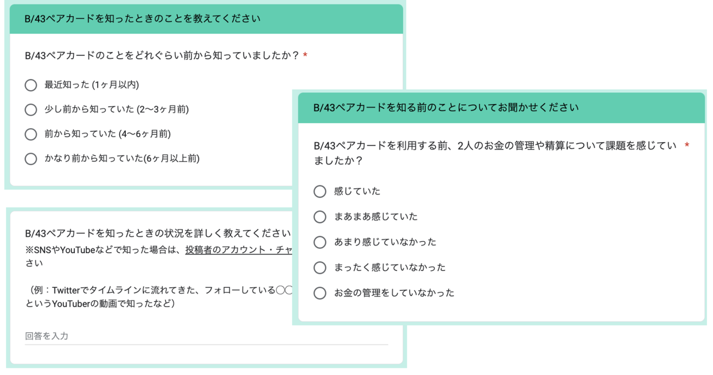 B/43を利用している方に定期的に配信しているアンケートを元に情報を収集します。 例えば、B/43をどこで知ったのか、どういった課題を感じていたのか、なぜB/43を手に取ってみたいと思ったのかなど。 ペアカードだと2人の関係性はどういった方が多いのかなども把握するようにしています。どの広告チャネルが有効的なのか、広告で訴求している内容は課題だと思っていることとマッチしているのかなどについて考察します。