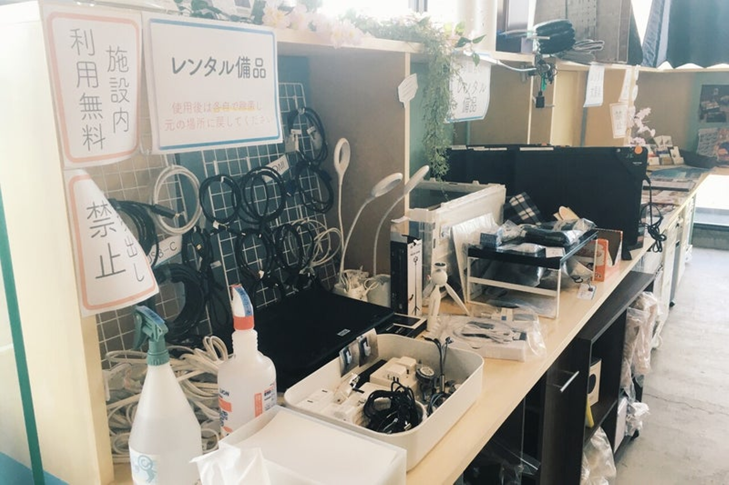 無料貸し出しのモニターがあったり、文房具や備品も揃っているため非常に便利です。