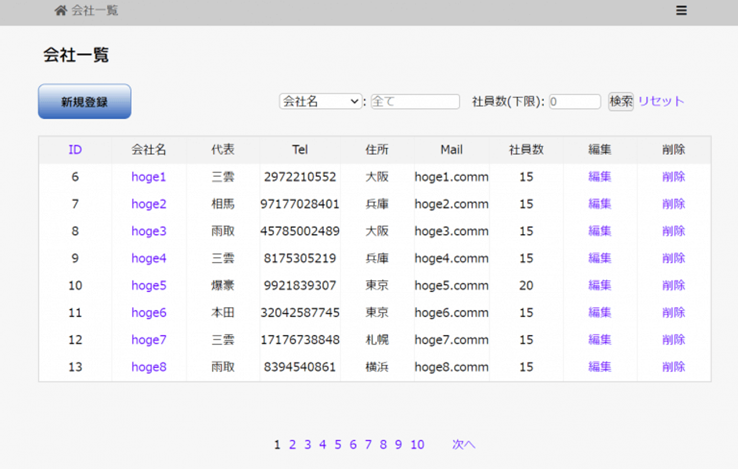 ・社員一覧:選択された会社の社員一覧の表示、社員の削除