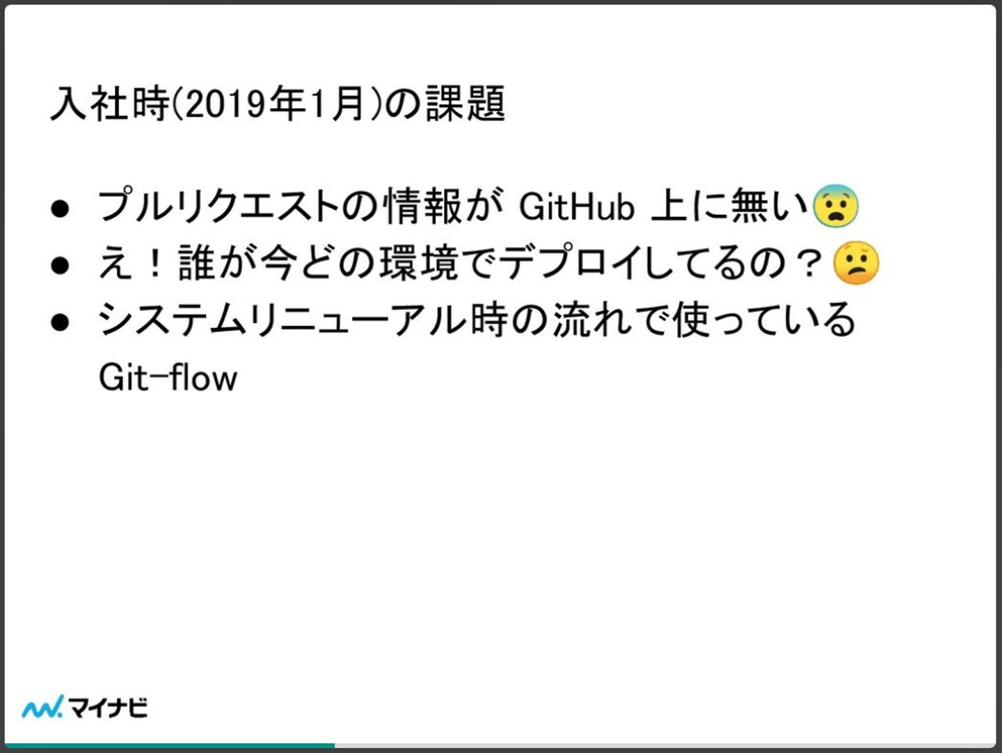 「私がマイナビにジョインした当初、前職と比べて、色々と開発環境が整っていませんでした。プルリクエストの情報がGiHub上に無い、誰が今どの環境でデプロイしているのかがわからない等、さまざまな課題がありました。こうした課題をひとつずつ解決していき、徐々に『チーム開発』ができる環境を整えてきました」(岡部)