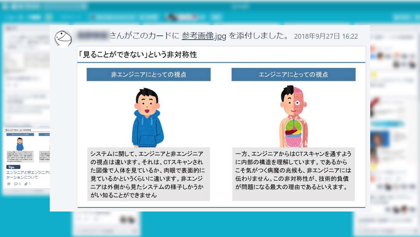 それに何よりこの問題を考える上で象徴的なものが、弊社のトレロ(タスク管理サービス)に貼ってある、「エンジニアと非エンジニアのコミュニケーションについて」というカード。それは「エンジニアと非エンジニアでは、見えているものが違う」ということを端的に示したツイートを貼ったものでした。