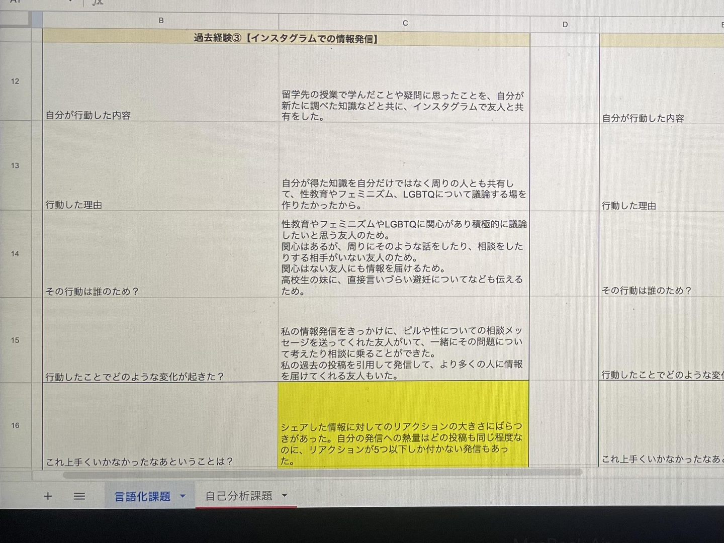 自己分析シート。リクルーターの先輩社員さんにとことん心の引き出しを開けてもらいました。