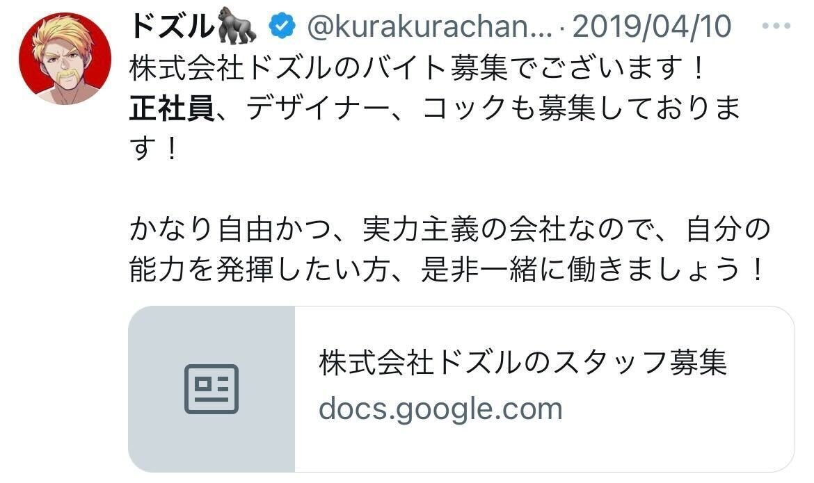 当時のスタッフ募集。現在はフルリモート環境のドズル社ですが、当時はオフィスへの出勤があり、コック(!)の募集もしていました