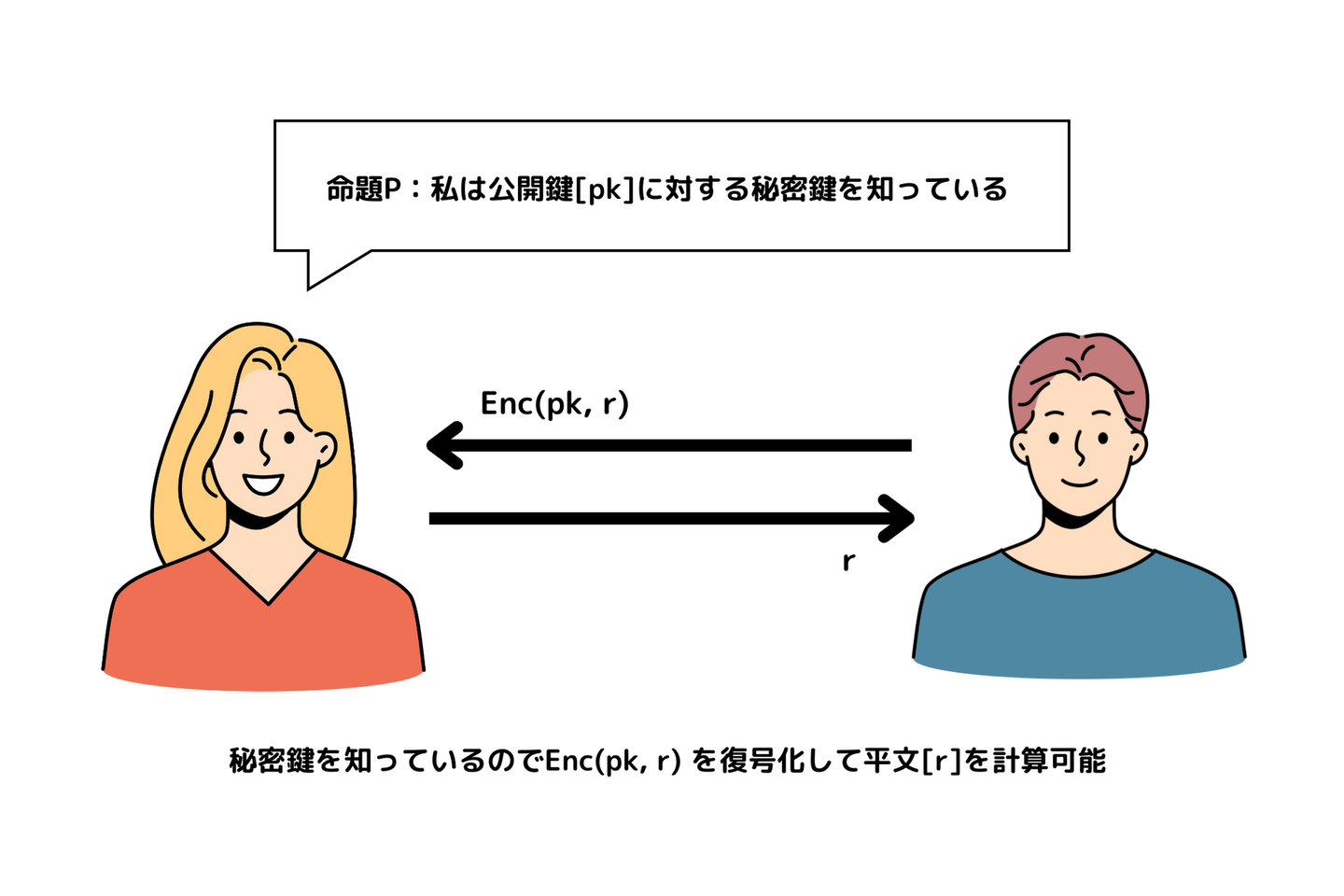 Bさん(Verifier)は自分で生成した乱数[r]を貰うだけなので、 対話終了後に秘密鍵に関する知識を得ていない状態。⇒これを『ゼロ知識』と捉えます。