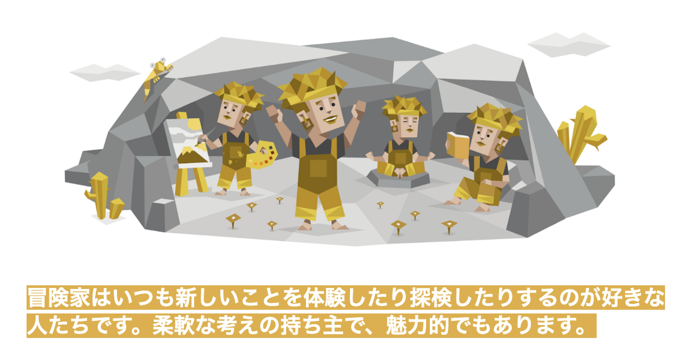 探究心と柔軟性を兼ね備えた冒険家と社交性と思いやりを持つ領事官の部長を筆頭に、協力し合うことを好み、常に高レベルであり続ける外交官グループのリーダー、そして豊かな想像力と倫理的思考を持つメンバーという結果になりました。