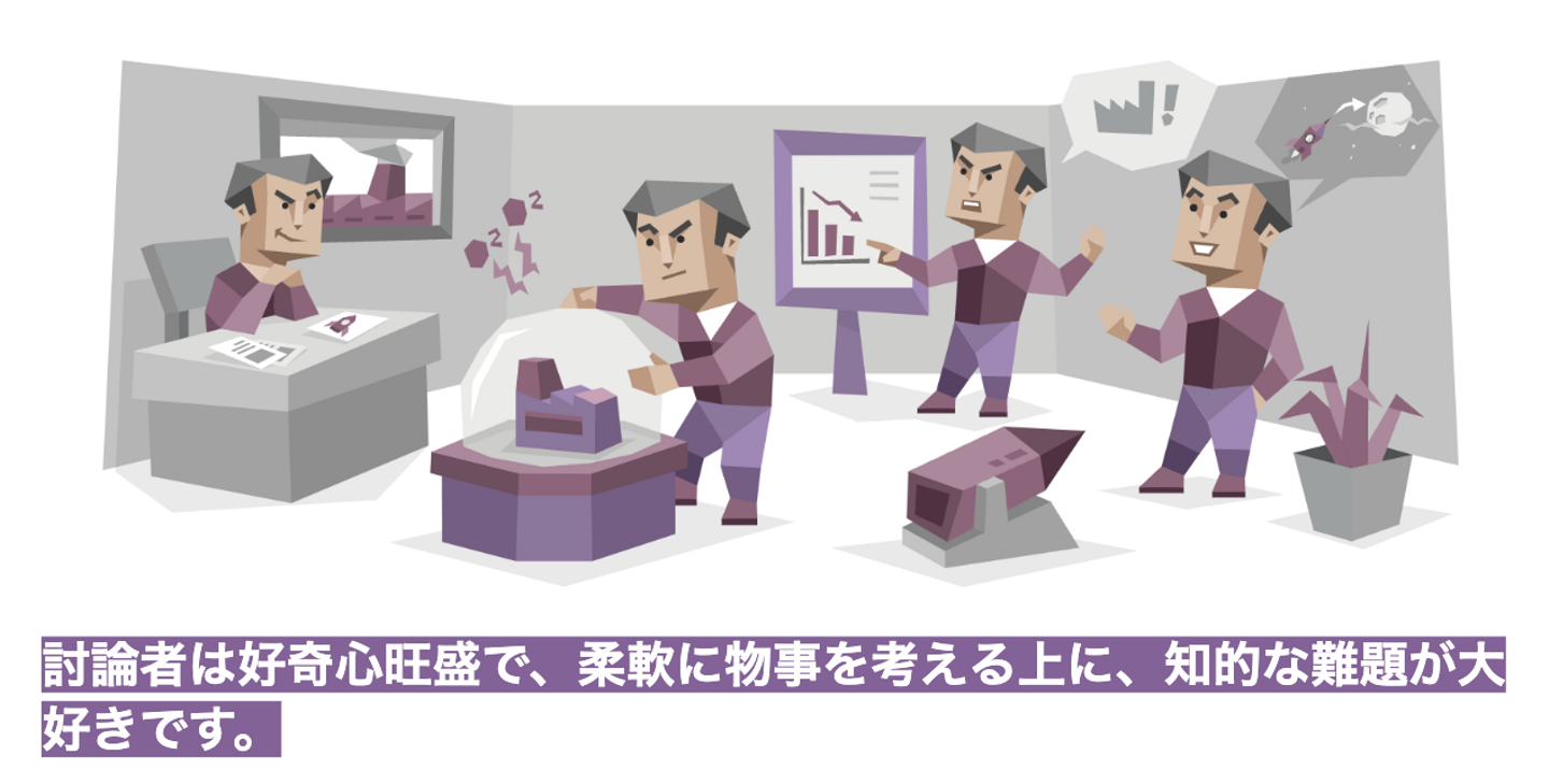 討論者は頭の回転が速い上に大胆な気質の持ち主で、迷わず現状に異議を唱えるタイプの人たちです。それどころか相手が誰であっても、またどんな内容であっても、反対意見を述べることに躊躇しません。議論することが何よりも大好きで、賛否の分かれるトピックに会話が進めば進むほど、面白いと感じるタイプです。
