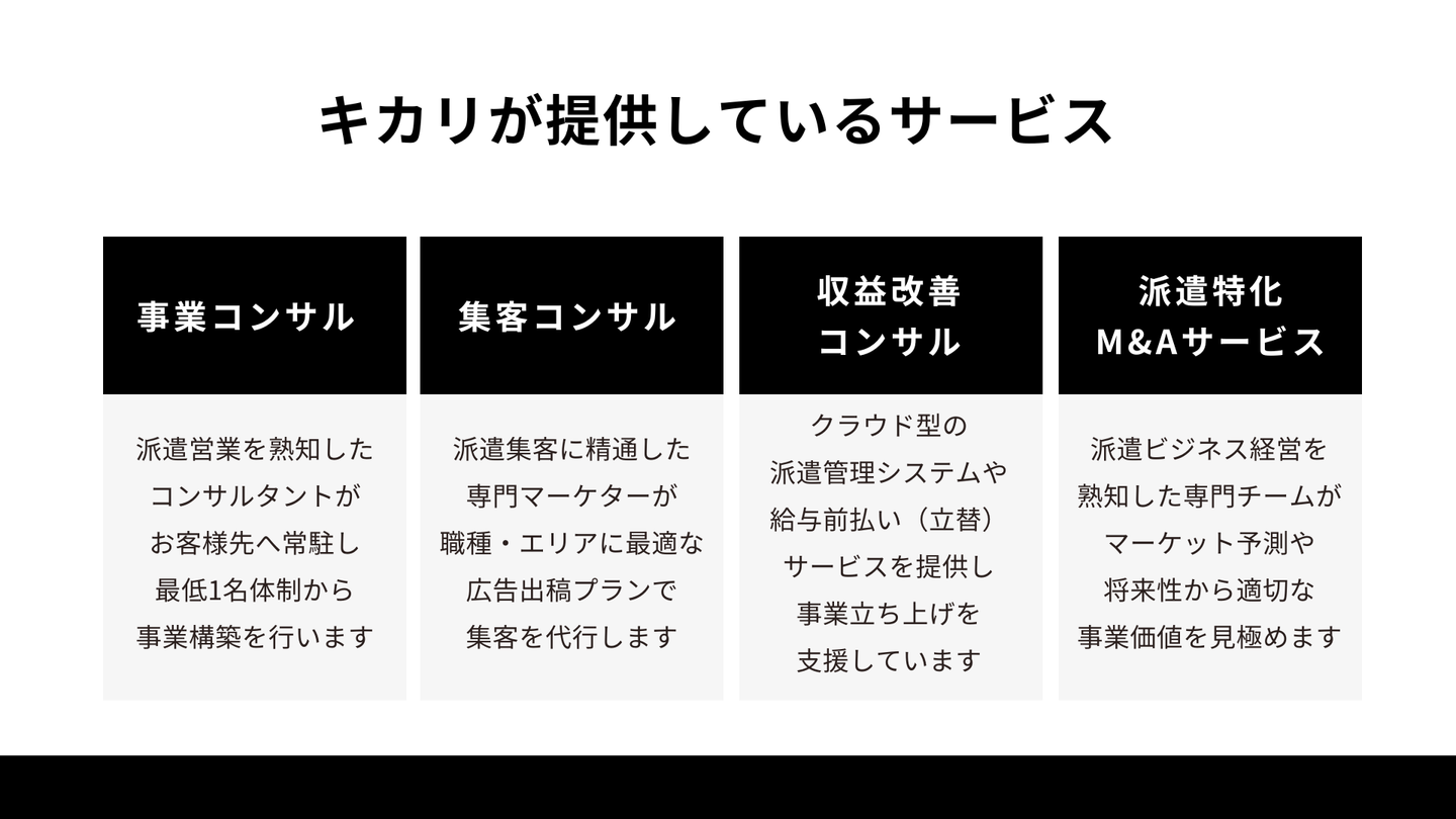 キカリは派遣会社のパートナーとして、これまで20社以上の派遣会社様の事業構築を行ってきました。多くの派遣会社さんは他社がどのような取り組みをしているのか、なかなか情報交換の機会がなかった、経営や事業の悩みを相談できる人がいなかったというお話しをよく耳にします。