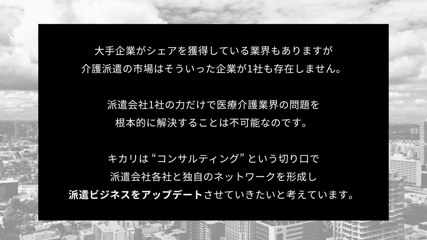 医療介護業界が人手不足であることは周知の事実ですが、この大きな課題を派遣会社1社だけの力で変えることは不可能です。キカリはコンサルティングサービスを通じ、派遣会社の事業をアップデートすることで業界全体の底上げを目指しています。