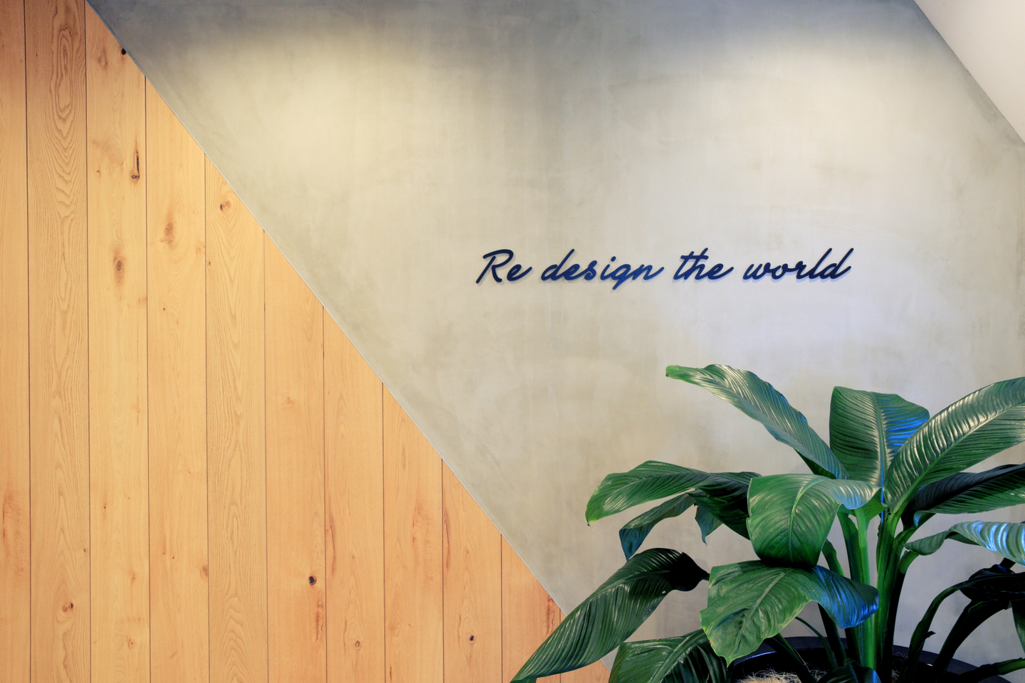 2階入り口:2階への階段を登ると"Re Design the World"のロゴがあります。(自社ながらかっこいいですね笑←2回目)